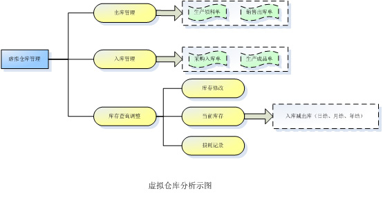 虚拟仓库管理是通过生产管理与采购管理进行出入库分析管理,通过计算机自动分析计算来体现库存情况的管理,为什么采用这种方式进行库存管理呢?因为烟花企业的仓库基本都分散在生产厂地,占地面积大,根据安全的需要都分散在偏僻空旷的山间,无网络环境,所以不可能实现各个仓库都有信息化办公环境,无法在实时进出库时进行实际仓库信息管理,只能通过统一的和虚拟的计算分析进行管理,所有仓库领料和入库到统一的仓库管理中心进行登记和查询,部分不能与时或不能到仓库管理中心进行登录的信息通过生产过程中使用情况分析计算出来,以达到相对精确管理仓库情况的目的。